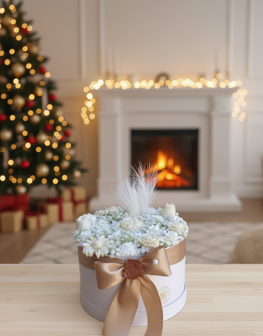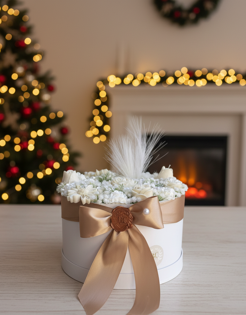 Uma luxuosa caixa redonda de flores, adornada com delicadas flores brancas e finalizada com uma fita dourada de cetim e um lacre em cera. Perfeita para oferecer ou para adicionar uma elegância intemporal a qualquer espaço.