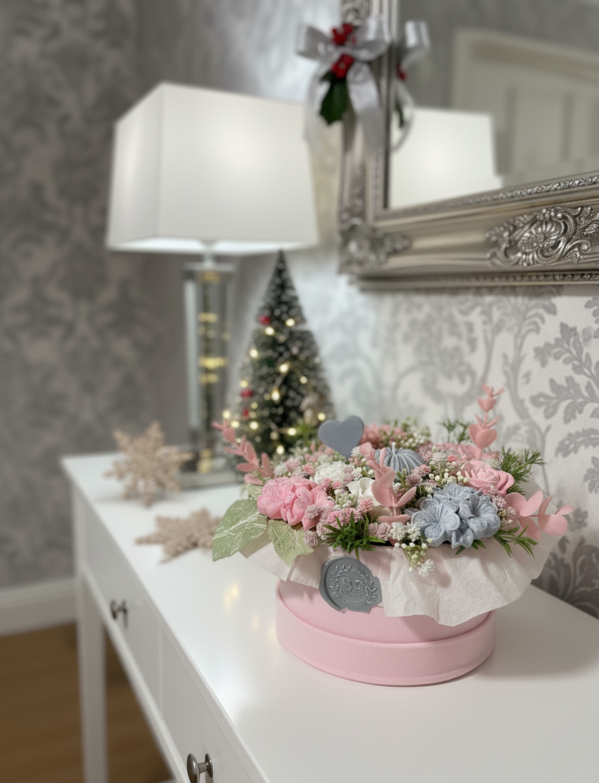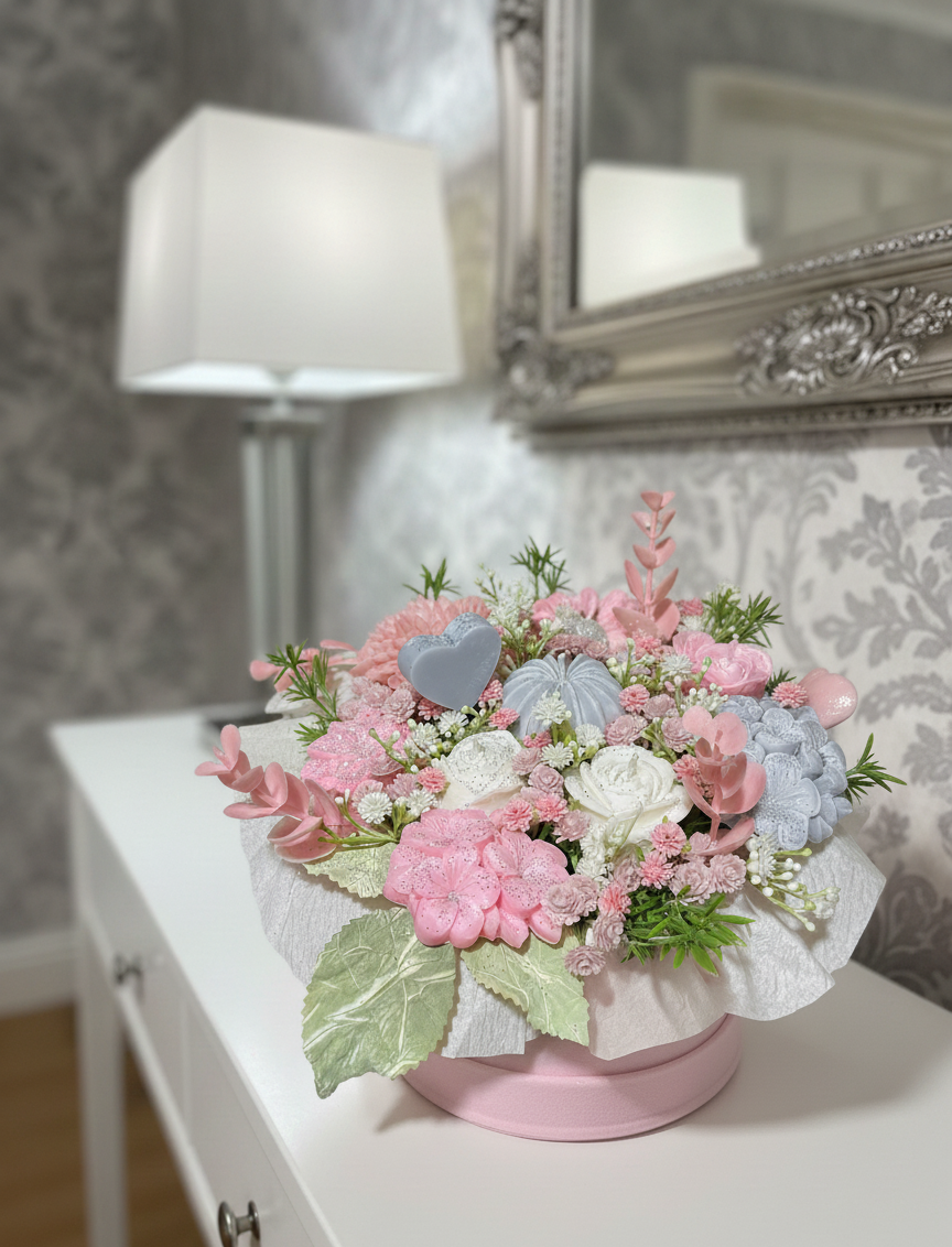 Suave. Romântica. Inesquecível. Esta caixa de veludo em tons de rosa blush, cinza dove e branco é esculpida à mão, flor a flor, em cera de soja. Ao contrário de flores naturais que murcham, esta beleza permanece intacta durante anos – uma lembrança permanente de momentos especiais.