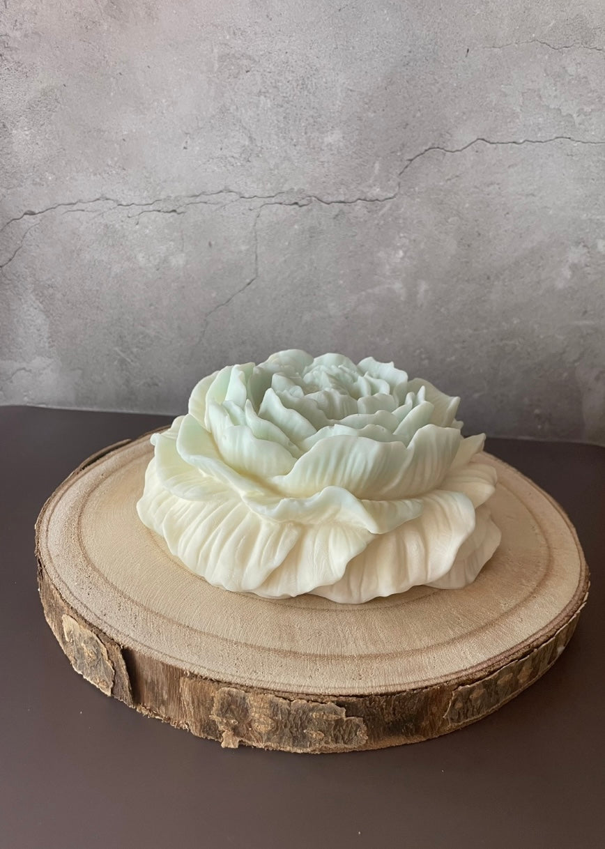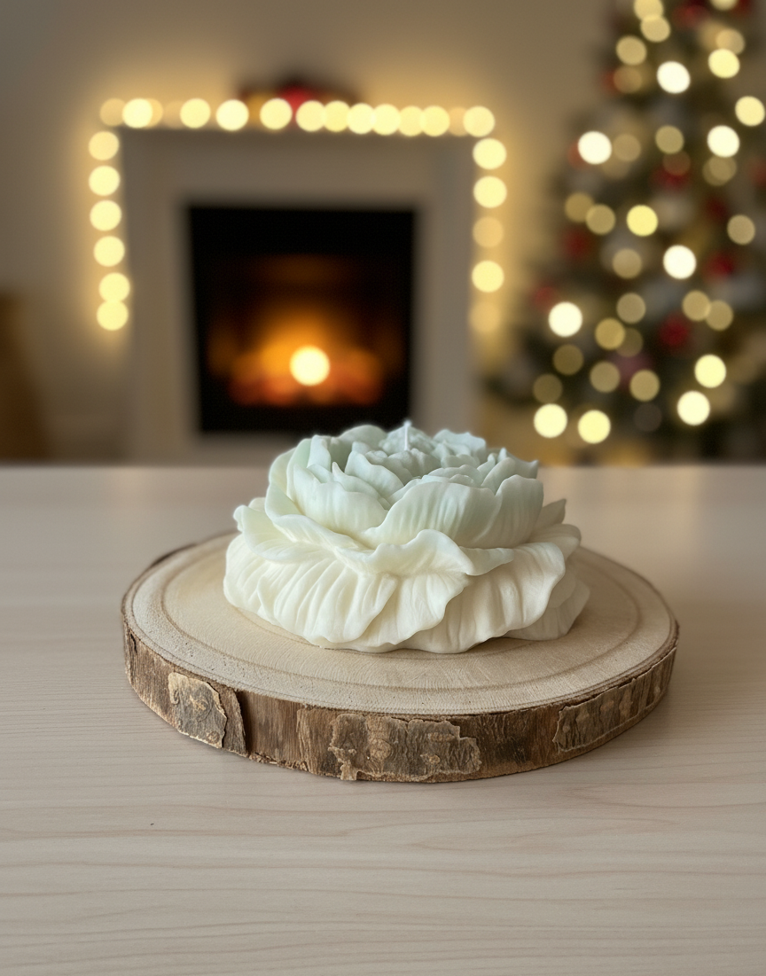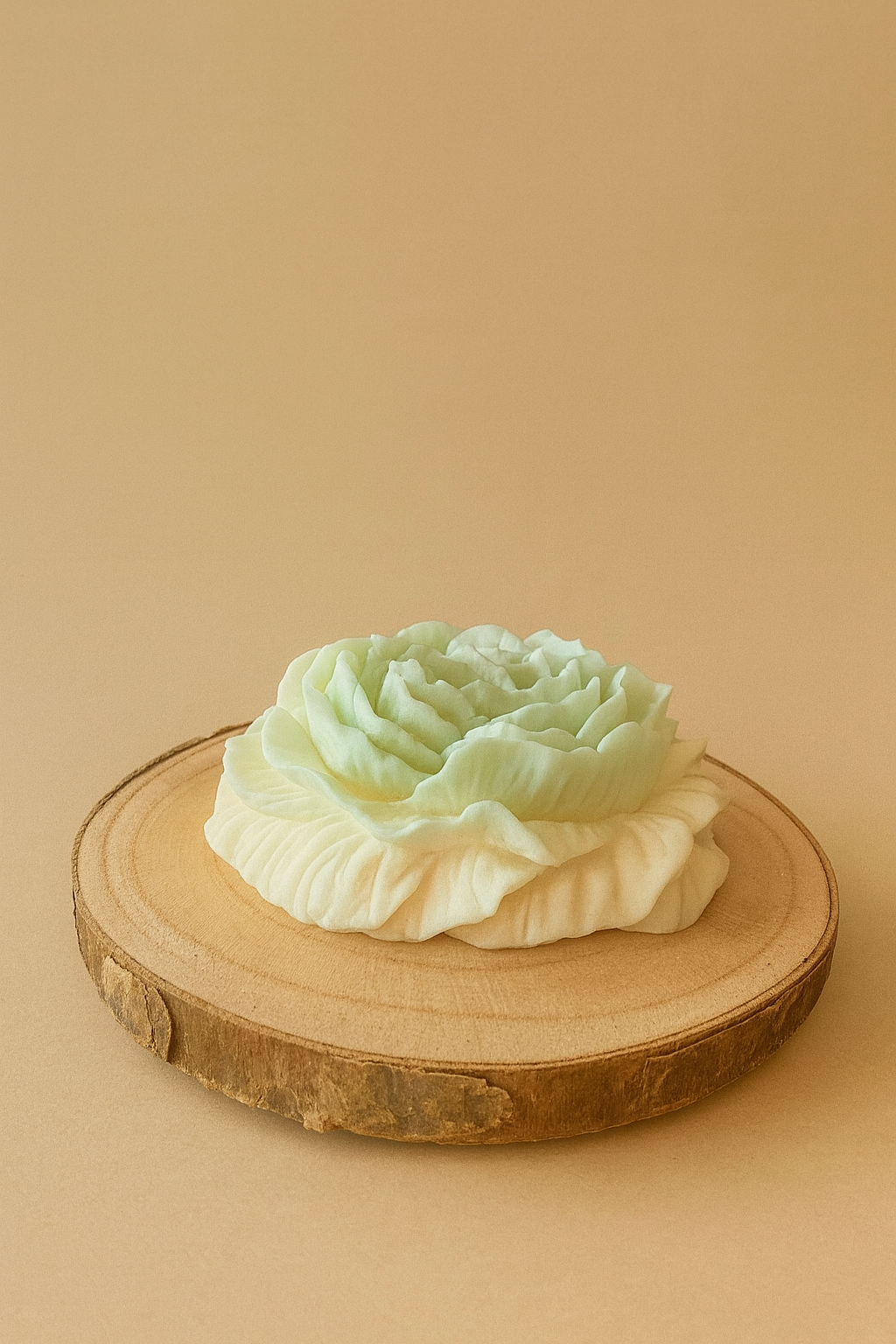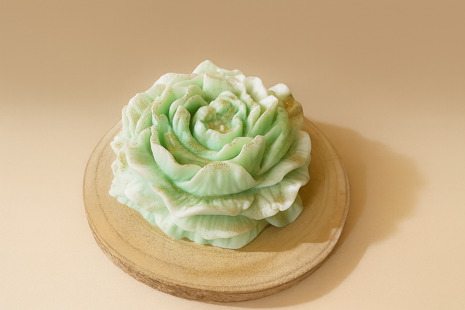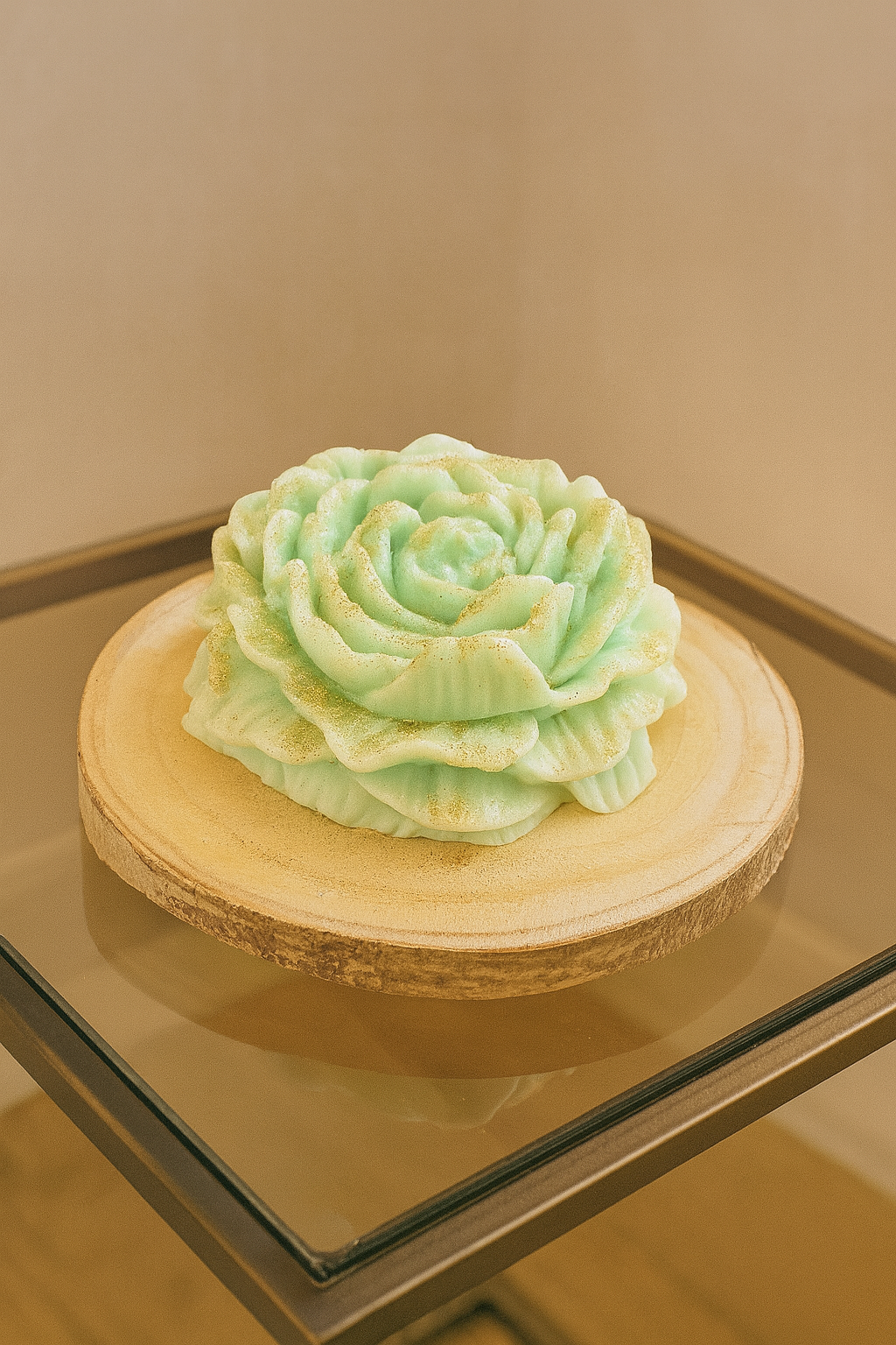 Uma vela lindamente trabalhada em forma de flor, delicadamente desenhada em suaves tons pastéis. Apresentada sobre uma base de madeira natural, esta peça traz elegância e aconchego a qualquer ambiente — perfeita como decoração ou como um presente especial.