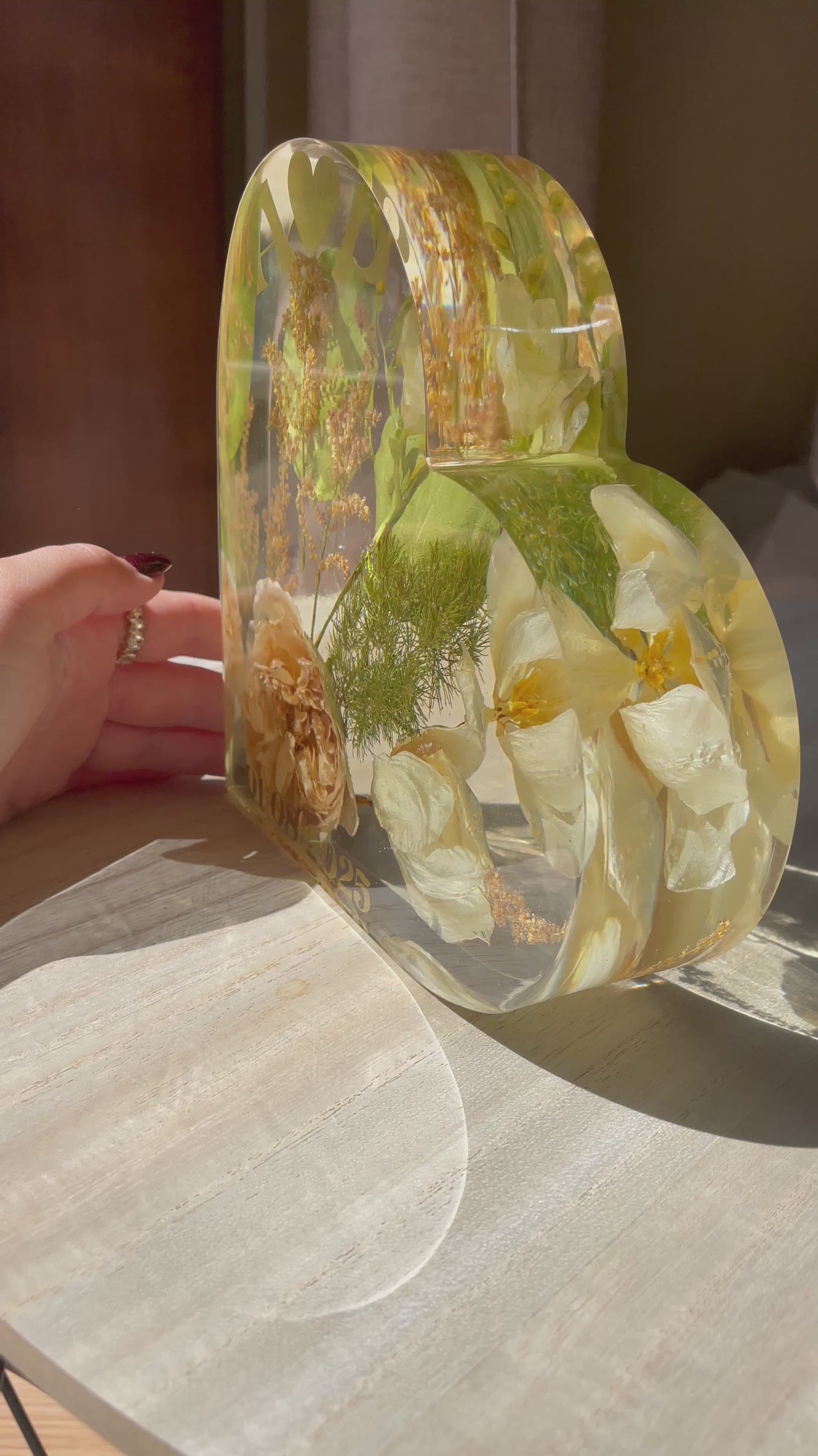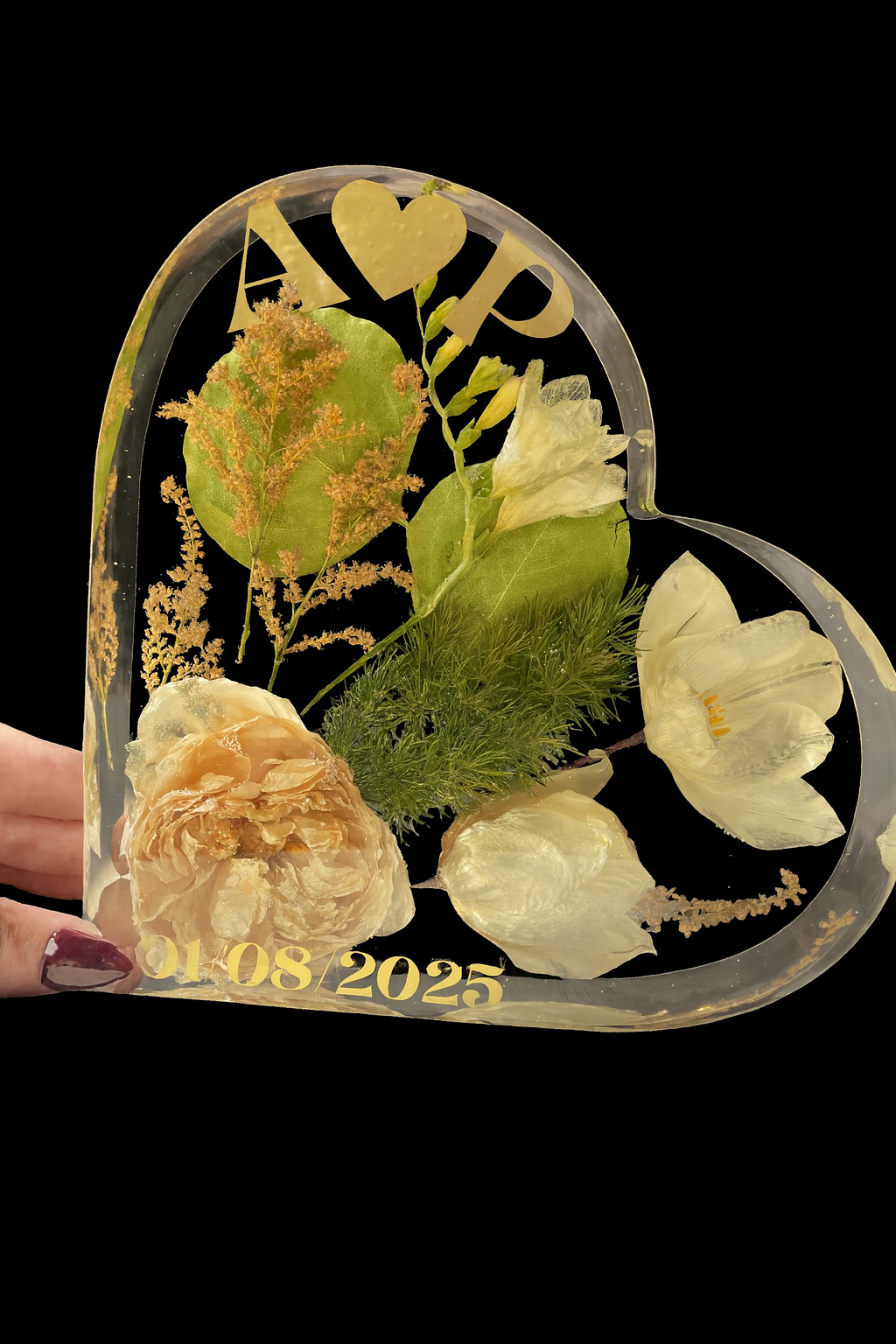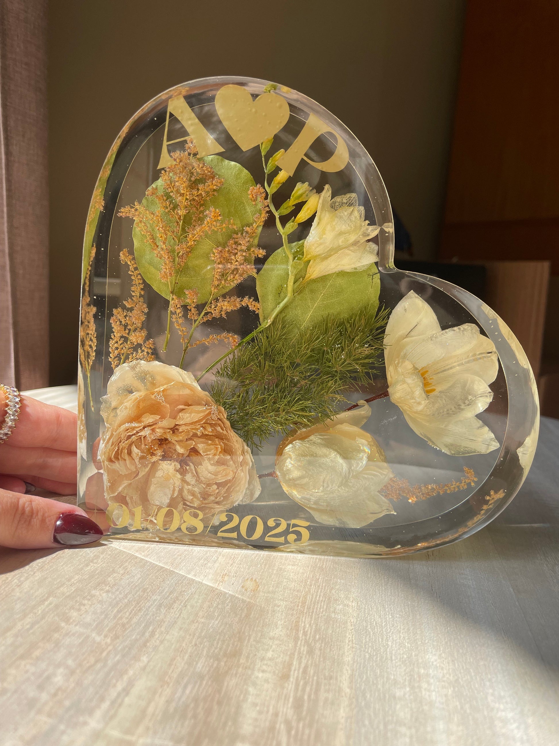 Uma recordação intemporal em resina em forma de coração, que preserva delicadamente flores reais do casamento com iniciais e data – uma peça única para guardar para sempre.