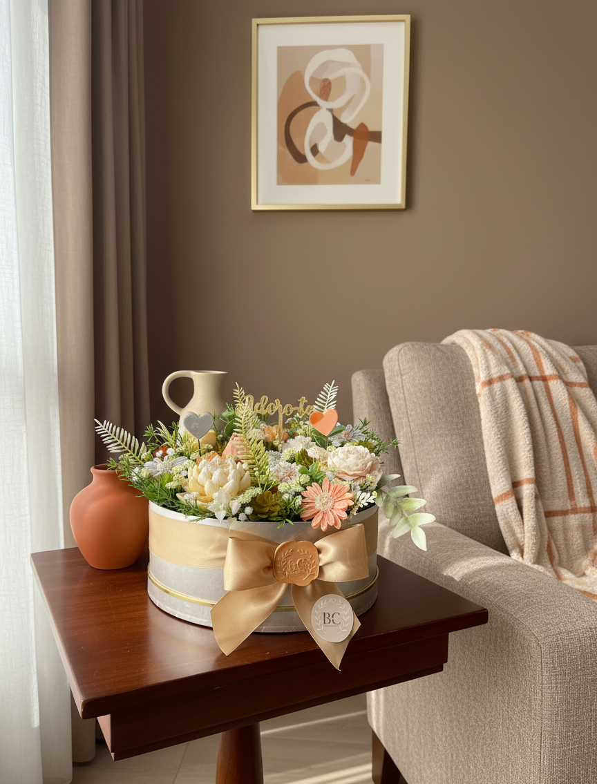 Bring warmth and sophistication to your holiday décor with this luxurious floral arrangement. Featuring soft cream roses, peachy gerbera daisies, and lush greenery beautifully presented in a premium keepsake box adorned with a champagne silk ribbon. Perfect as a centerpiece for festive gatherings or a thoughtful gift that captures the cozy elegance of the season.
